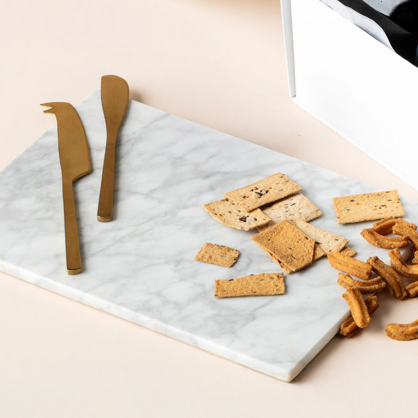 Curated for the modern host, this luxe gift bundle blends timeless design with practical entertaining essentials that will take pride of place in your client’s home. The elevated natural marble serving board, coasters & gold satin cheese knives are paired with classic stemless glassware making this a memorable gift designed to impress and delight.