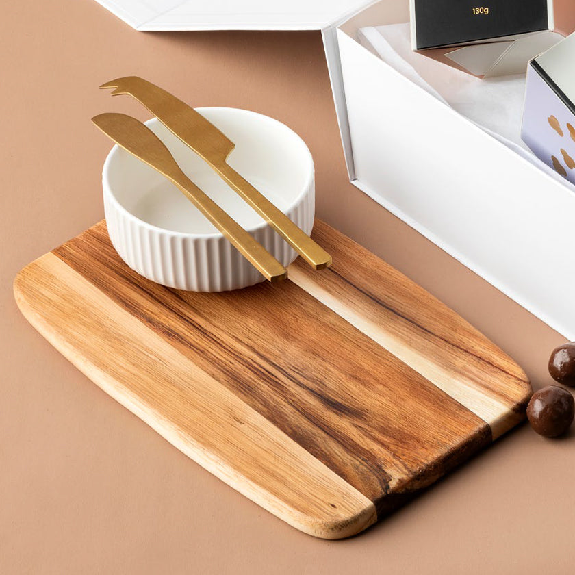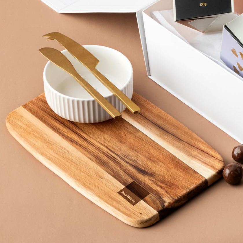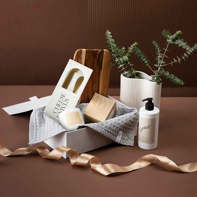 Thoughtful, practical and designed to impress – whether its helping clients prepare for their first open home or celebrating the excitement of moving in, this beautifully curated gift is designed to bring warmth and style to any space. A classic timber serving board, gold cheese knives and 100% cotton tea towel are entertainers essentials, while Verdier handwash, a luxe soy candle and elegant infinity vase ready for fresh blooms add little touches of luxury to make a truly memorable gift.