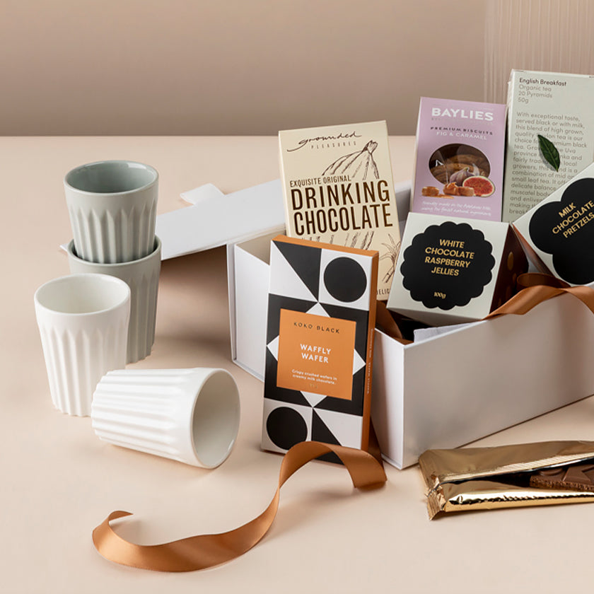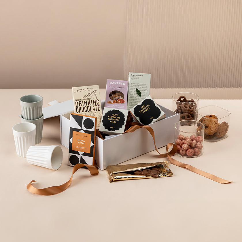 A carefully curated gift bundle filled with premium tea, indulgent chocolate, and café-style essentials. Designed to elevate office gatherings, or family morning teas this selection brings warmth, connection, and a little indulgence for workplaces, or families at settlement.